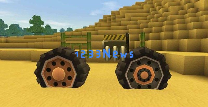 首先需要准备转向车轮和动力车轮各一个,将它们安装在地面上,两个车轮之间要空出一格距离。然后在车轮上方放置竹围栏作为车身框架,在框架中央安装无限引擎作为动力源。