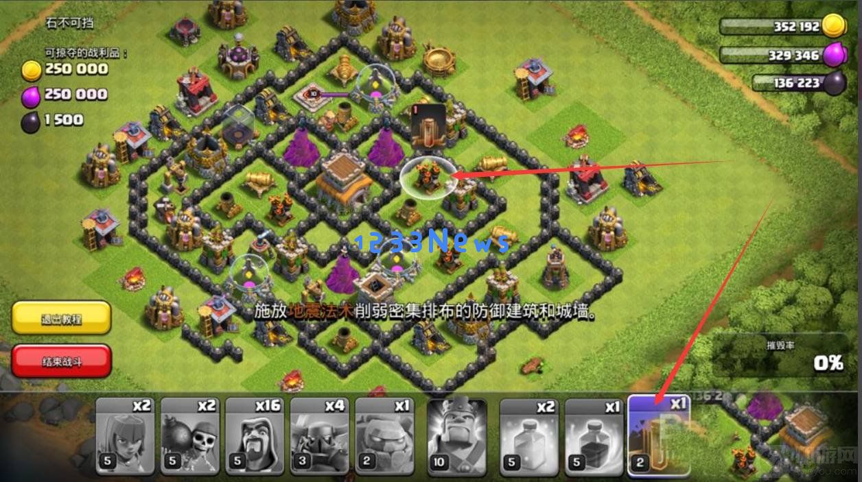2、进入战斗,直接利用地震法术,削减敌人防御建筑的血量。