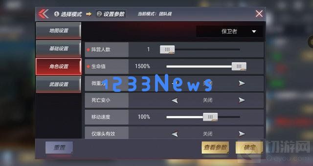 2.然后点击“角色设置”,调整为保卫者一方,将阵营人数调至1,生命值调整到最高,移动速度拉满,击杀回血拉到最大值,死亡复活时间拉到最低。