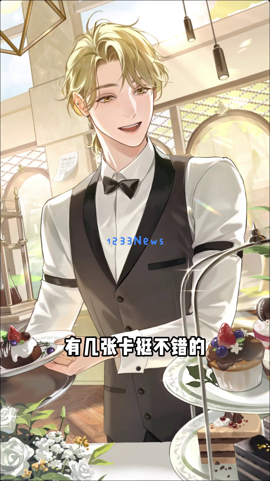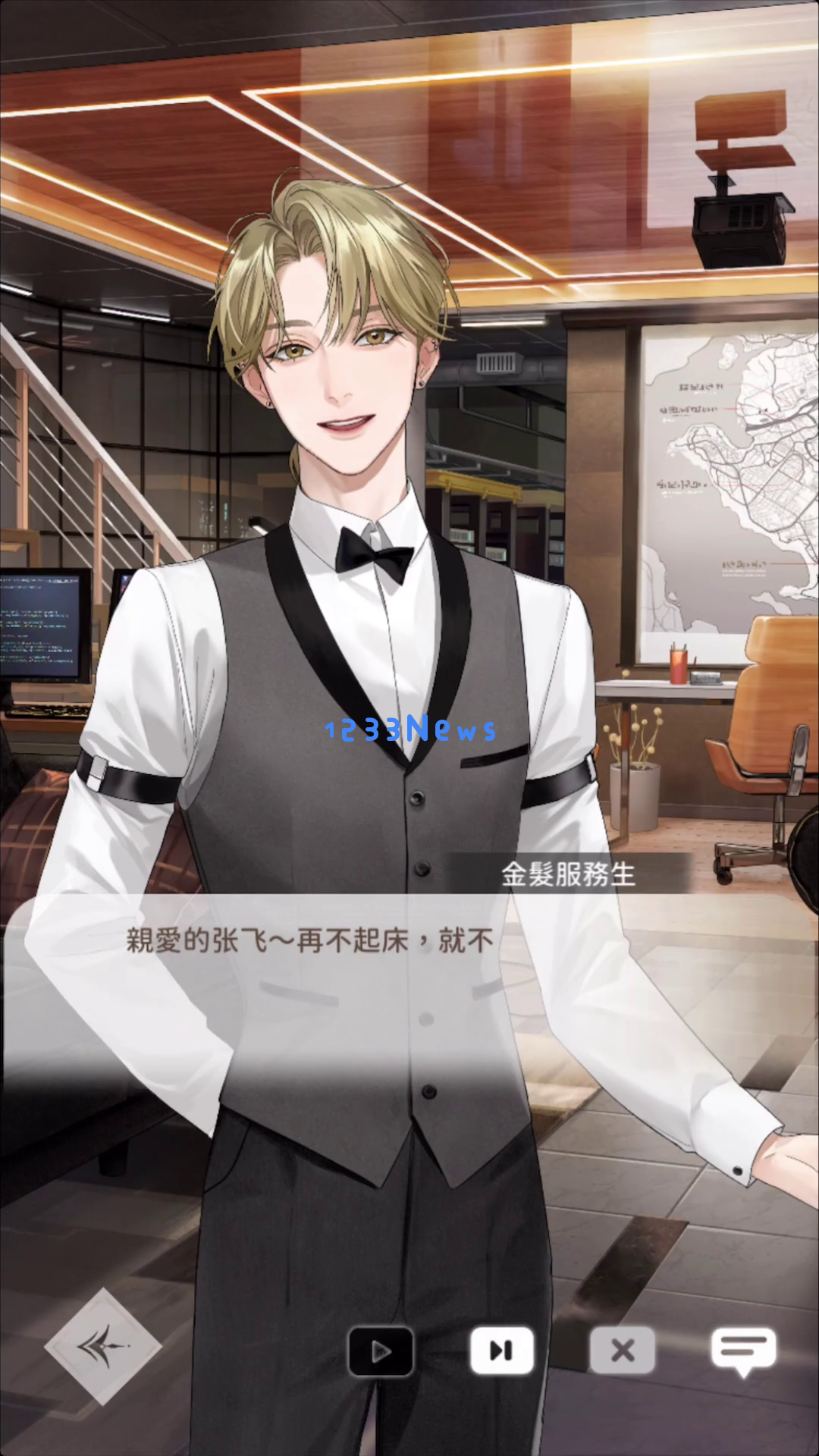 除了升级界面,游戏还提供了丰富的对话场景。例如,在一个现代化的办公室环境中,金发服务生角色与店长姐姐进行对话。他面带微笑,语气温和,给人一种亲切的感觉。
