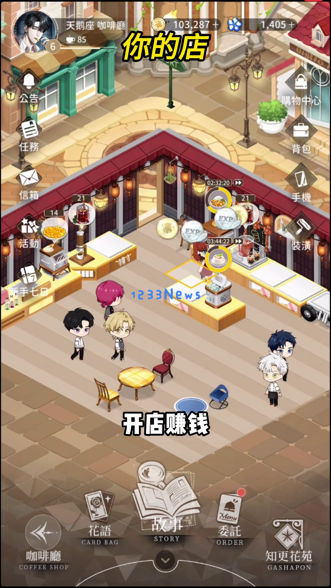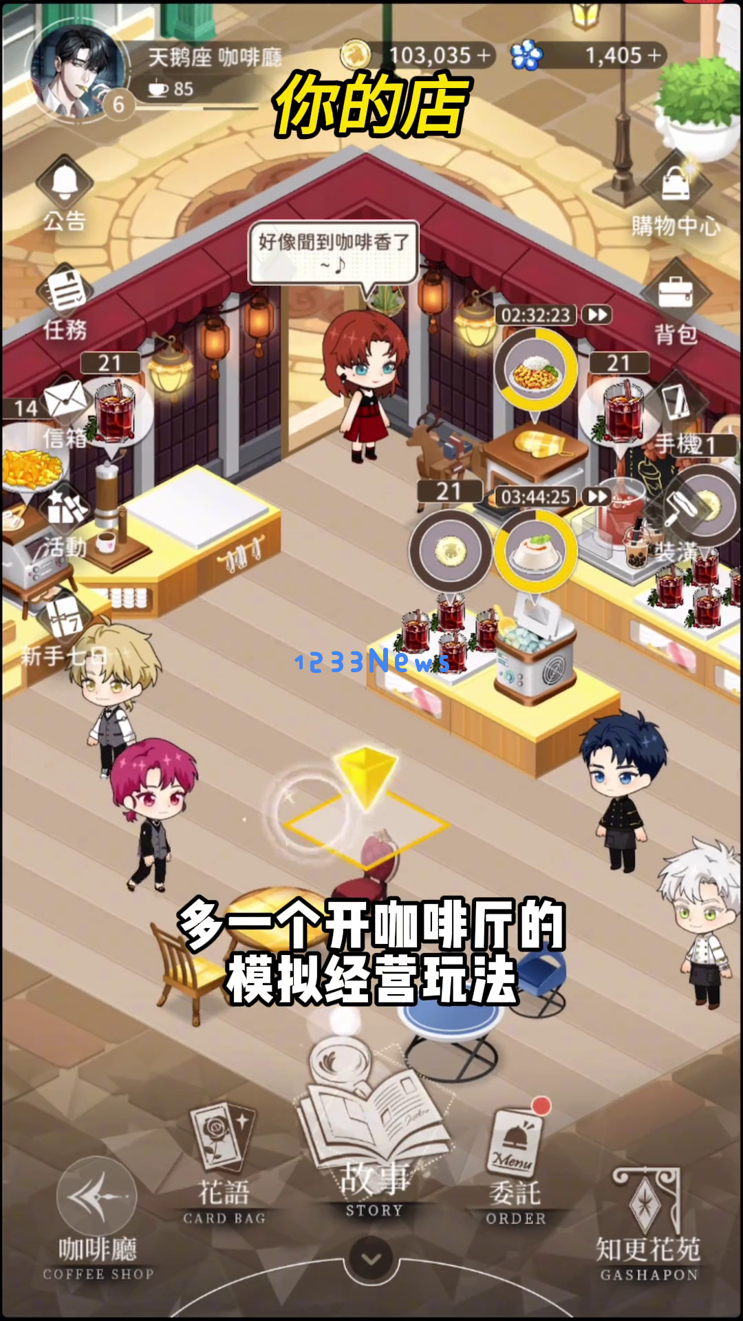 游戏的整体玩法类似于四大大陆旅游,包括看剧情、抽卡、约会等多种玩法。此外,还有一个特别的模拟经营玩法——开咖啡厅。你可以装修咖啡厅、开店赚钱,并让Q版男主们帮你干活。