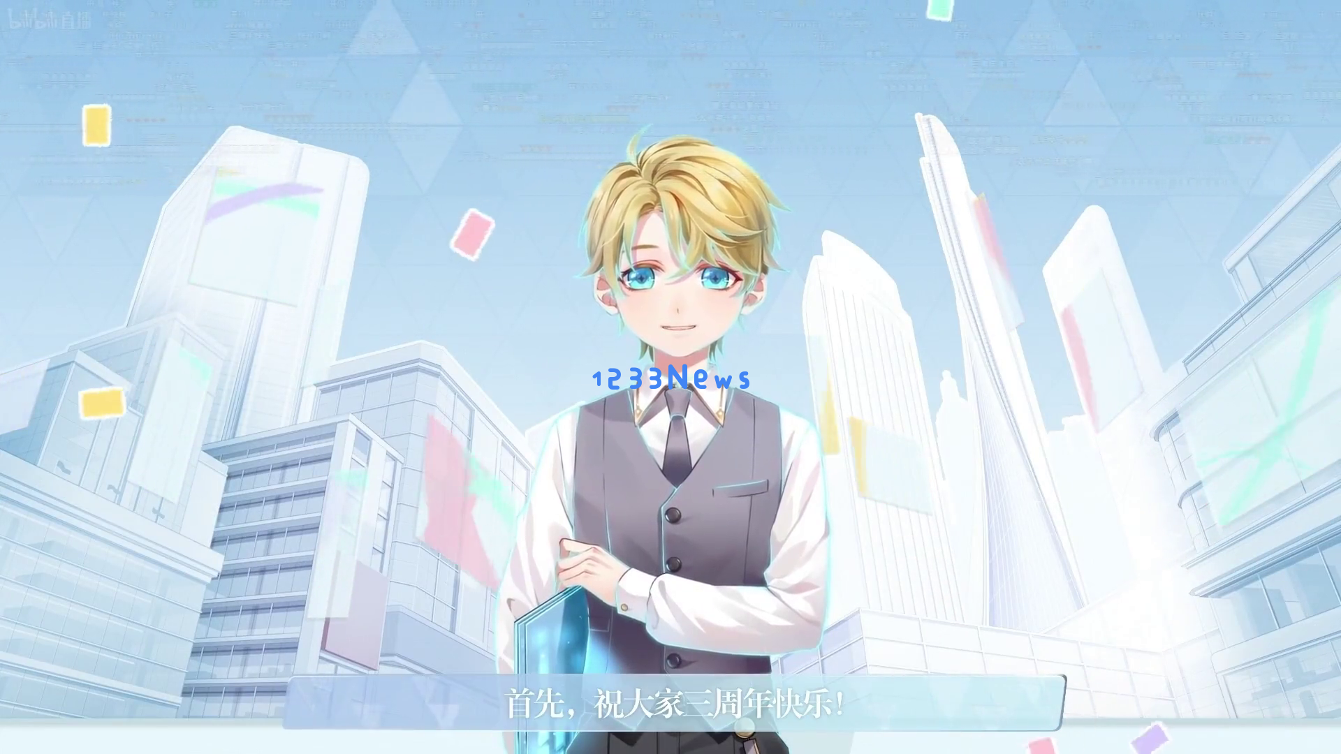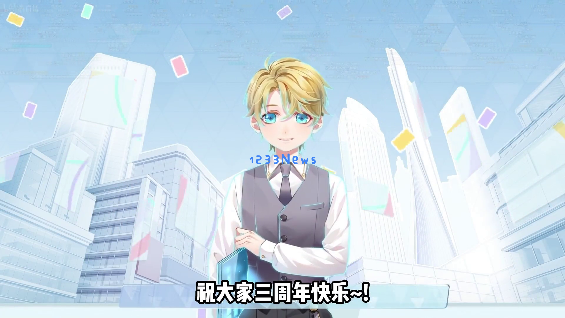 紧接着,一个金发蓝眼的男性角色出现在现代化的城市背景下,他双手交叉放在身前,自信而优雅地向大家传达了节日的祝福:“首先祝大家三周年快乐!”这不仅是对玩家的问候,也是对游戏三周年的庆祝。