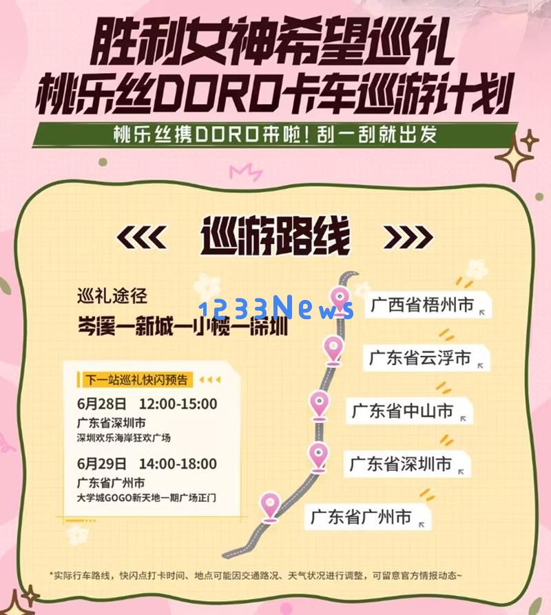 《胜利女神》希望巡礼机乐丝卡车巡游正在火热进行中,桃乐丝携DORO卡车已经开启多地巡游,与各地的指挥官们见面。已公布的巡游站点包括上海、太原、昆明、成都、深圳和广州。