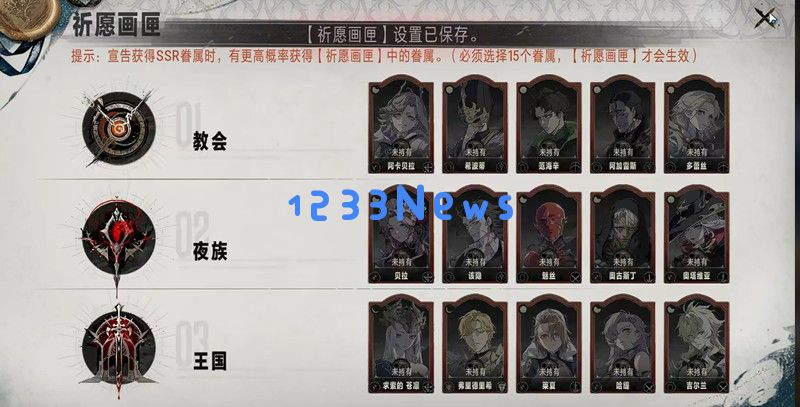 在常驻池中,玩家累计抽取40次后可以开启祈愿画匣功能。这个功能允许玩家从三个阵营中各选择5名SSR角色加入心愿单,共计15名角色。加入心愿单的角色在后续抽卡时会有更高的出货概率,这大大提升了玩家获取特定角色的机会。