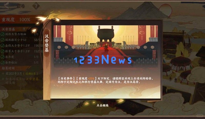 第三回合:还定三秦。第一个月就发展商业和农业,因为后面会触发历史事件,通关条件就会变。这回合最重要就是外交,因为当河南,韩友善>80且军力>1500会触发外交事件。过程请看攻略。