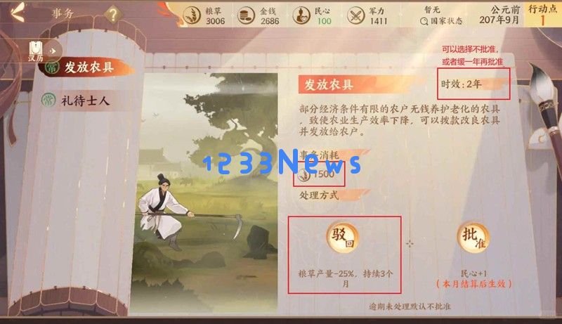 最后一回合,汉帝登基。不要全部把城池攻占,保持57个就可以,其他国家友善值保持绿色哦,然后疯狂发展内政。如图6所示,这是我最后一个月的资源情况。有些事务可能会导致减产的,如图5所示,斟酌去批准。