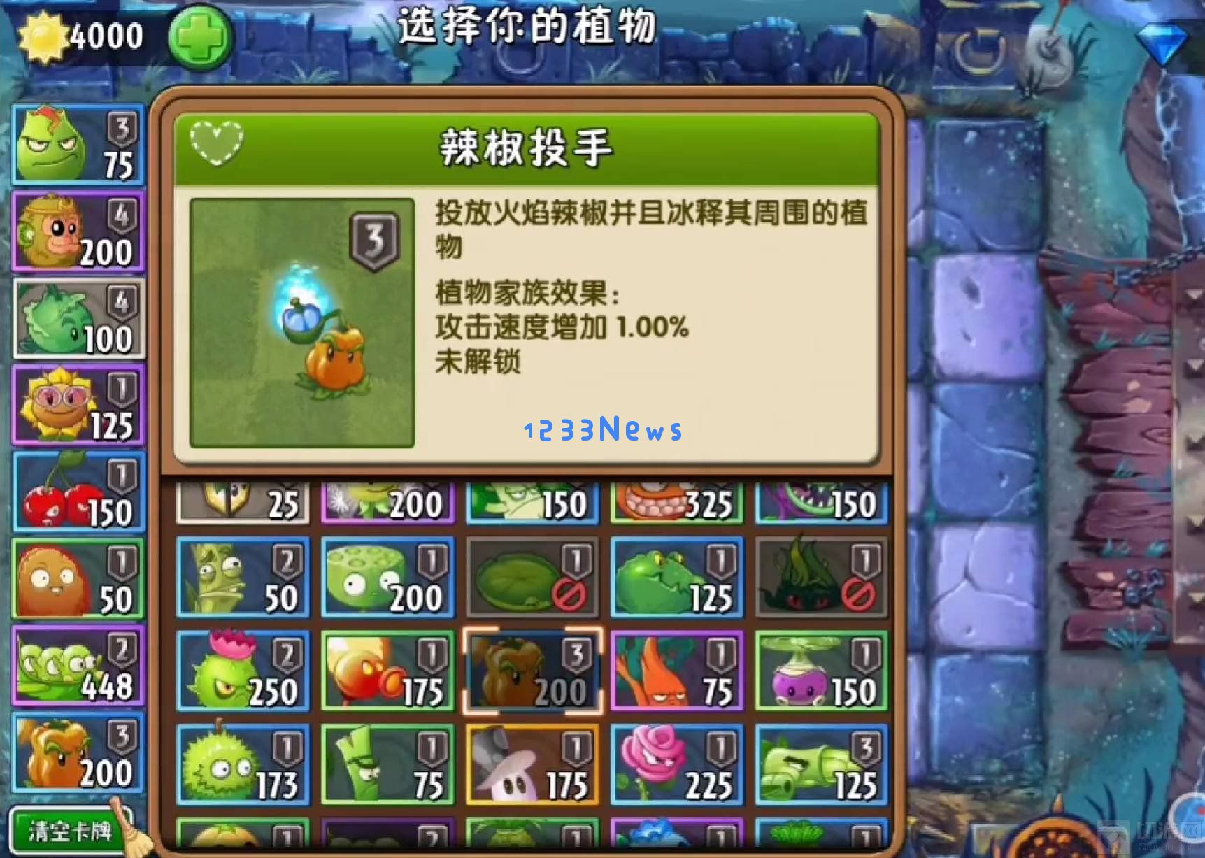 三、在第二排种上辣椒投手,中间种一个豌豆突击队,第三排种一排猴头,第四排种包菜投手,最前面种一排爆炸坚果,准备好之后,点击开始战斗。