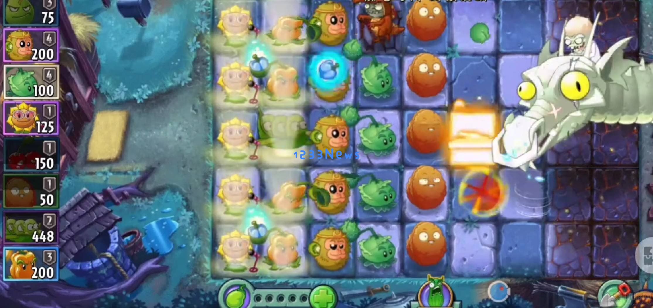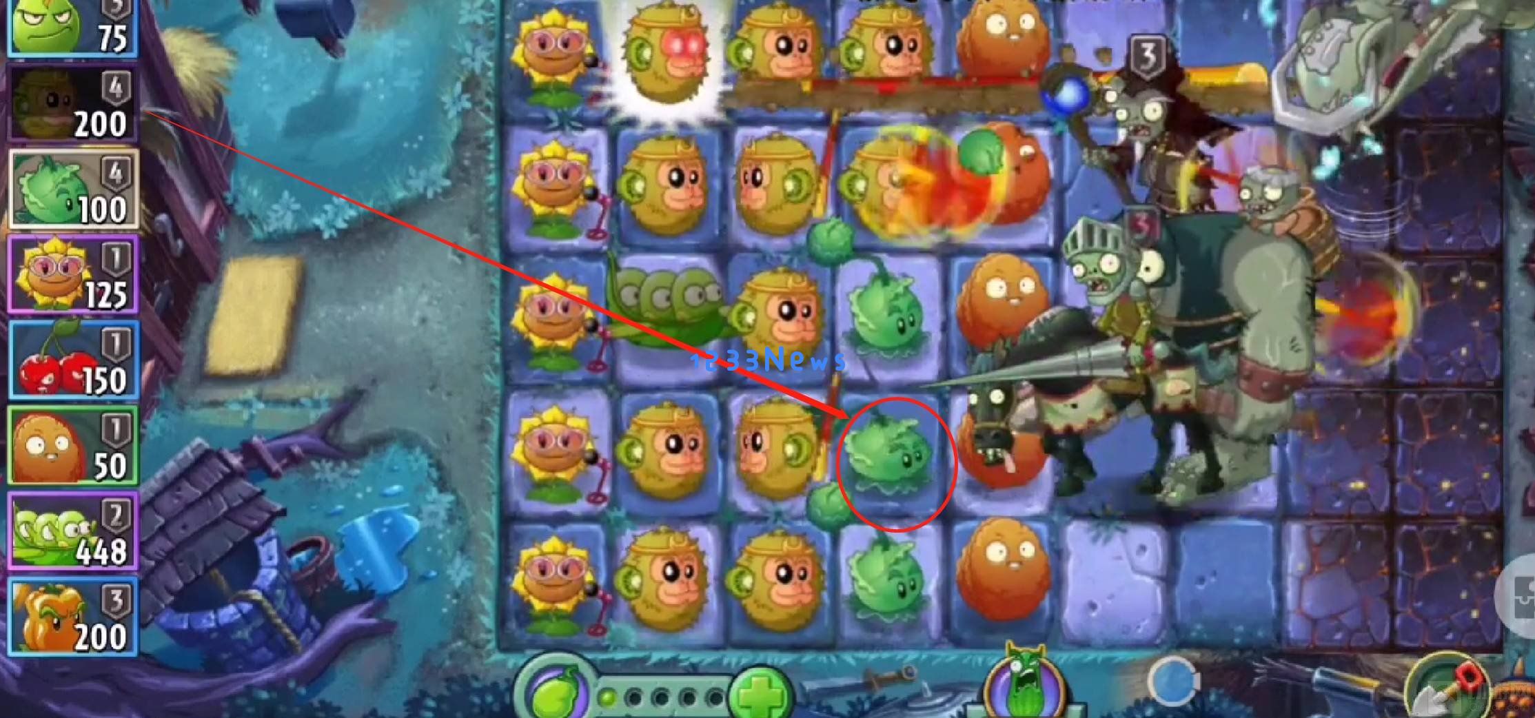 七、最后一波喷火龙会召唤一个大锤子僵尸和一个骑兵僵尸,再把包菜投手换成猴头就能打败了。