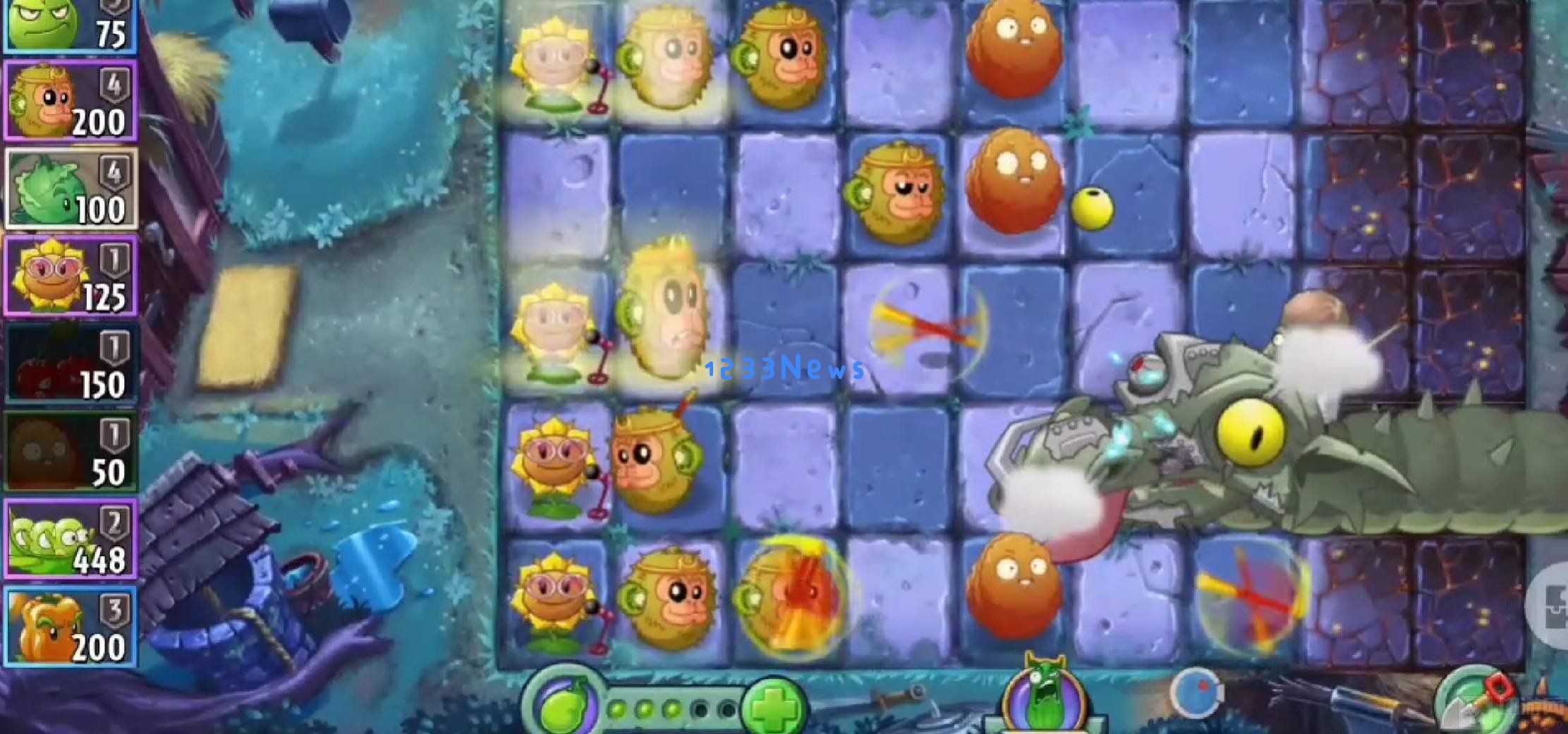 五、随后喷火龙召唤了一只大锤子僵尸,只用把最后一排的辣椒投手换成猴头来提高最后一排的火力,很快大锤子僵尸就没了。