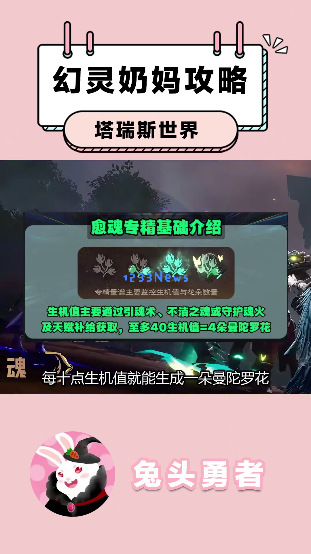 每十点升级值就能生成一朵曼陀罗花,消耗所有花朵能够释放灵魂链接,下次使用生魂草时会被替代为生魂绽放。每消耗一朵曼陀罗花增加生魂绽放百分之二十五的治疗效果,最多能达到百分之五十。这样能够很好地提高团队血线,从而减少对奶妈的操作要求。