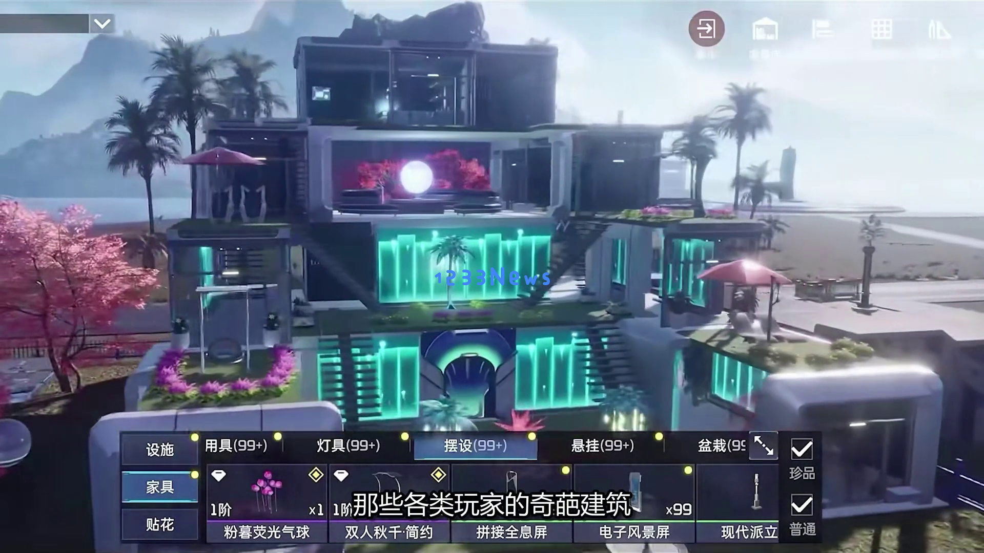 接着,镜头切换到一条蜿蜒的道路,道路穿过一片热带雨林,两旁是高大的棕榈树和其他植被。画面下方出现一行中文文字:“奇葩建筑年年有,今年特别多。”这句话仿佛在告诉我们,游戏中总是不乏那些别出心裁的玩家。