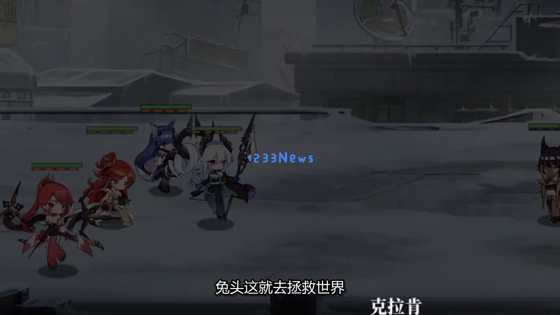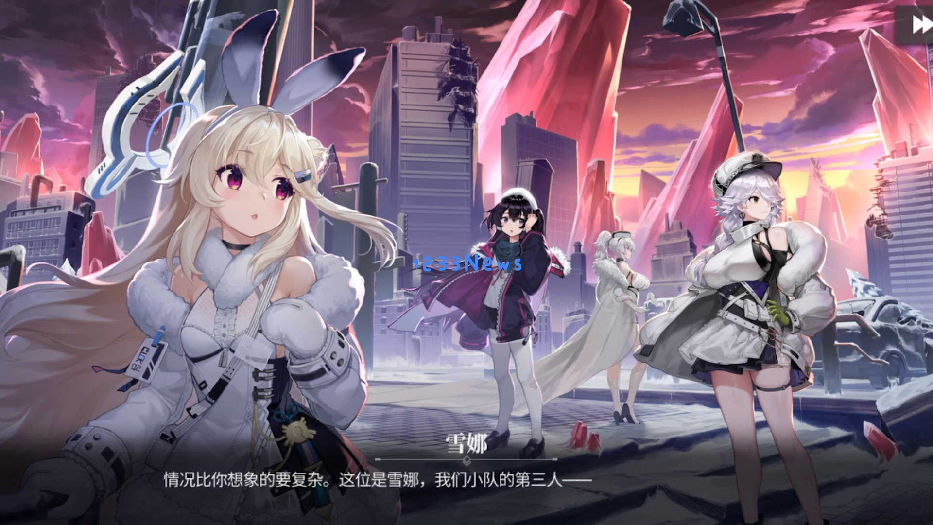 随后,镜头切换到另一个场景,一名蓝发女性角色站在黑暗的城市中,手持武器,姿态自信。她背后的白色翅膀更是让她显得格外耀眼。她似乎在说:“芬里尔 Hey yo! 今天真是... 我与人类最后的希望共鸣者少女们一起。”这句话充满了力量和决心。